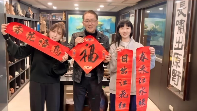 臺灣山東鄉(xiāng)親在視頻中展示收到的福字和春聯(lián)