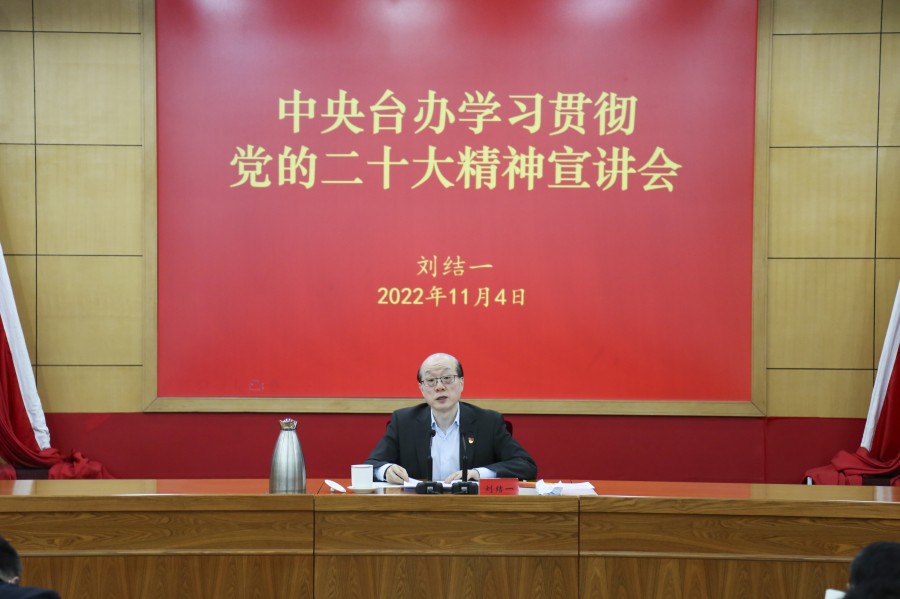 11月4日,中央臺(tái)辦舉行學(xué)習(xí)貫徹黨的二十大精神宣講報(bào)告會(huì)。中央臺(tái)辦、國(guó)務(wù)院臺(tái)辦主任劉結(jié)一作宣講報(bào)告,中央臺(tái)辦副主任陳元豐、龍明彪出席會(huì)議,機(jī)關(guān)局、信息中心、海研中心、交流中心全體黨員干部和其他事業(yè)單位黨支部委員參加,駐部紀(jì)檢監(jiān)察組派員參加會(huì)議。