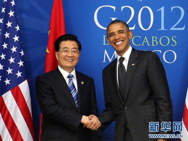 6月19日,中國(guó)國(guó)家主席胡錦濤在墨西哥洛斯卡沃斯會(huì)見(jiàn)美國(guó)總統(tǒng)奧巴馬。 新華社記者 蘭紅光 攝